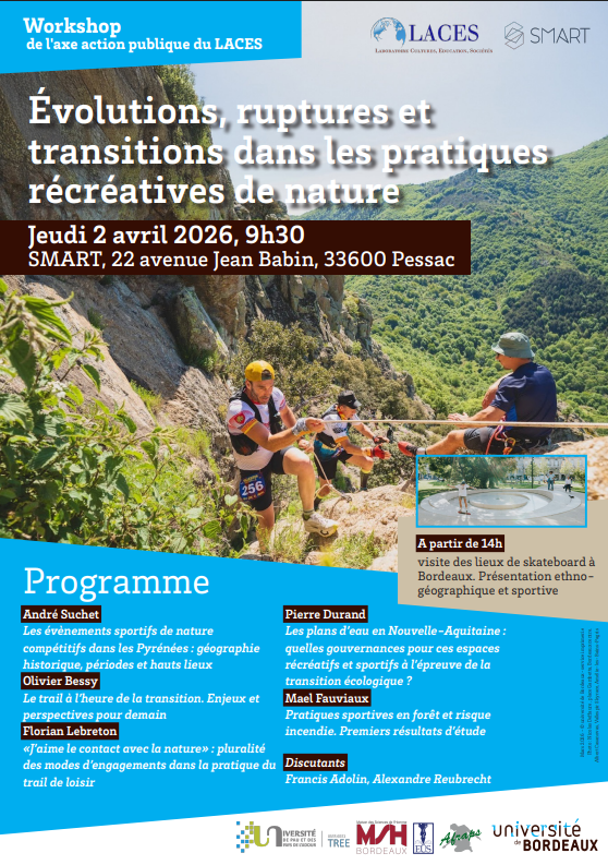 L’axe action publique du LACES organise jeudi 2 avril un workshop intitulé « Évolutions, ruptures et transitions dans les pratiques récréatives de nature » à l’université de Bordeaux, Faculté des STAPS, au SMART, et en partenariat principal avec l’AFRAPS. Retrouvez l’affiche de l’événement ci-dessous.